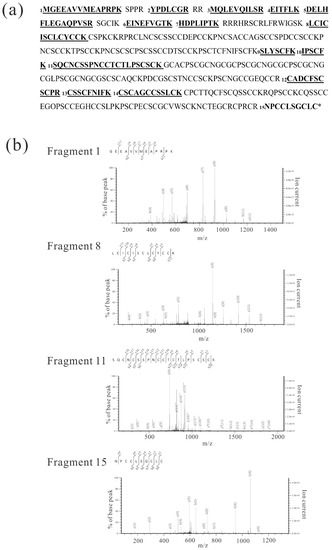Figure 4a presents examples of fragments with high accuracy, the MS/MS results of fragments 1, 8, 11, and 15. Based on these results, we concluded that the 55-kDa and 27-kDa proteins were Gγ4 and Gγ4∆Cys, respectively. When the NCBI protein database was used for the analysis of Gγ4 candidates, Gγ4 was found to be annotated using other names, such as ACL27948.1.