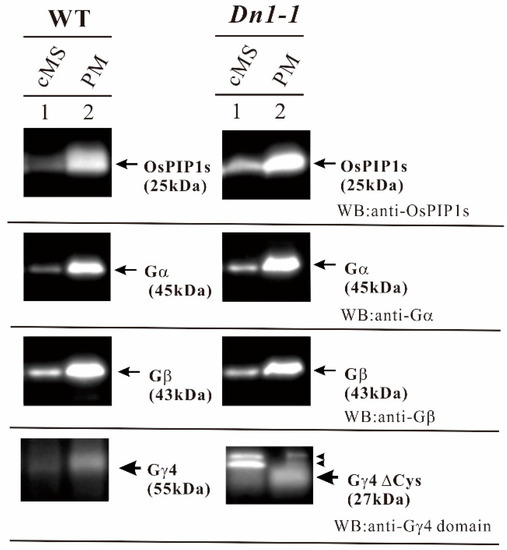 As LC-MS/MS analysis showed that anti-Gγ4 domain antibody reacted with Gγ4 and Gγ4∆Cys, the amount of Gγ4 and Gγ4∆Cys in the crude microsomal fraction was compared to that in the plasma membrane fraction by western blot (Figure 5). This was in order to check whether Gγ4 and Gγ4∆Cys are enriched in the plasma membrane. To confirm the purity of plasma membrane, the OsPIP1s aquaporin was used as a plasma membrane marker. Gα and Gβ are the subunits of heterotrimeric G protein complex in rice. OsPIP1s, Gα subunit, and Gβ subunit were enriched in the plasma membrane fraction. Gγ4 (55 kDa in WT) and Gγ4∆Cys (27 kDa in Dn1-1) were also enriched in the plasma membrane fraction. These results showed that Gγ4 (55 kDa in WT) and Gγ4∆Cys (27 kDa in Dn1-1) were localized in the plasma membrane fraction. Non-specific bands (indicated by arrowheads) detected by WB were not analyzed.