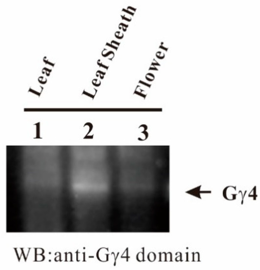 To identify the tissues in which Gγ4 accumulates, the accumulation profile of Gγ4 was studied using plasma membrane fractions of leaf of 1-week-old etiolated seedling, developing leaf sheath, and flowers of WT by western blot. Gγ4 protein predominantly accumulated in the developing leaf sheath (Figure 6).
