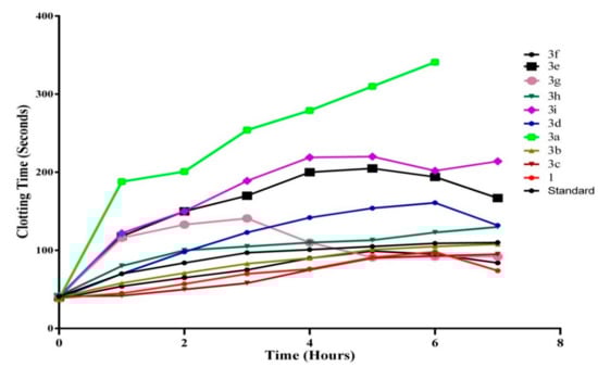 Time course determination of anticoagulation activity of tested compounds 3a–3i and 1. Heparin was used as standard drug.