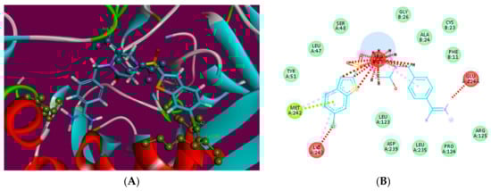 Ligand 3a showed the most potent interaction with the F-Xa active site with a score of 6270 and an ACE of −352.28 kcal/mol (Supplementary Table S1). Visual inspection of these complexes predicts a binding conformation of ligand 3a, which showed significant interaction with the F-Xa binding site compared to the other ligands. The interacting residue of this complex is Arg25 (Figure 5). Ligand 3a has shown a potential hydrogen bond between NH adjacent to carbonyl and phenyl groups and Arg25. The length of the hydrogen bond was 2.94 Å indicating significant interaction. Similarly, ligand 3a exhibited hydrophobic contact potential with pocket amino acids Ala24, Pro43, and also depicted pi-sulfur contact potential with Cys44.