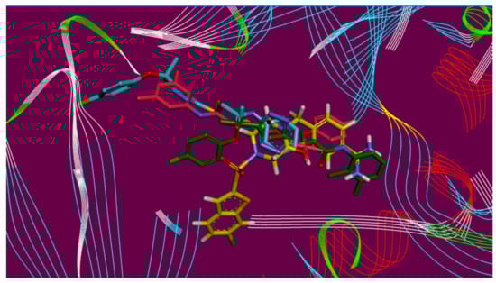 There are four binding pockets labeled as S1 to S4 within the active site. The most important are the S1 and S4 binding pockets that are exploited by Factor Xa inhibitors. The S1 pocket is in the form of a narrow cleft and it usually favors positively charged moieties such as benzamidine, amine, and guanidine [24]. S4 is the second main binding pocket shaped by different amino acid residues [25,26]. The energy score (S) was the main criterion to evaluate the binding affinity of ligand (Supplementary Table S1). The compound having highest binding affinity forms the most stable ligand-enzyme complex. The results of docking studies: energy score, involved factor Xa active site amino acid residues, and interacting ligands moieties for each compound and the reference inhibitor are given in Supplementary Table S1 and Figure 2, Figure 3, Figure 4 and Figure 5. Analysis of docking results showed that standard RPR200095 has a score of 5192 with an Atomic Contact Energy (ACE) value of −197.81 kcal/mol (Figure 2) when it docked with F-Xa and exhibited hydrophobic contact potential with pocket amino acids Lys243, Arg25, and Met242.