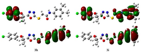 The energy of frontier orbital’s, namely, the Highest Occupied Molecular Orbital (HOMO) and Lowest Unoccupied Molecular Orbital (LUMO) are very popular parameters from quantum chemistry and calculations provide valuable information about molecular systems. The energy gap between HOMO and LUMO (Egap) measures the kinetic stability of the molecule [27]. A large value of the energy gap implies high kinetic stability and low chemical reactivity. Furthermore, the energy gap between HOMO and LUMO explains the intermolecular charge transfer (ICT) within the molecule, which is responsible for the bioactivity of the molecule. The distribution pattern of the FMOs has been illustrated in Figure 6. In all the studied derivatives 3a–3i, except 1 in which HOMOs delocalized on 4-chlorophenoxygroup, the HOMOs had leading contribution from N-arylacetamide and the adjacent sulfur atom. Similarly, LUMOs also had a dominating contribution from the N-arylacetamide moiety except for 3g, 3h, and 1 which had a major contribution from the 4-chlorophenoxy group. However, in the case of 3i HOMOs delocalized on both benzene rings along with acetamide groups. The ICT has been observed from N-arylacetamide to the 4-chlorophenoxy group units in 3g and 3h.