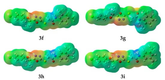 Undoubtedly MEP is a very useful tool to understand molecular interactions. Especially, its 3-D mapping is widely used to explain the relative reactive sites for the electrophilic (negative region) and nucleophilic (positive region) attack in a molecule. It also provides visual understanding of the relative polarity of the molecule. To predict reactive sites for electrophilic and nucleophilic attack of all synthesized compounds, the MEP surface maps have been calculated and illustrated in Figure 7. The different colors represent the different values of the electrostatic potential at the surface. Negative and positive Electrostatic Potential (EP) regions are indicated by red and blue, respectively, while the neutral potential regions represented in green.
