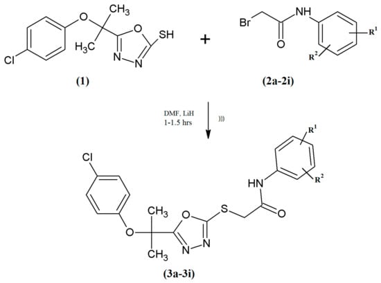 The targeted compounds (3a–3i) (Table 1) were synthesized as depicted in Scheme 1. The key intermediate compounds 5-[2-(4-chlorophenoxy)propan-2-yl]-1,3,4-oxadiazol-2-thiol (1) and N-substituted-2-bromoacetamides (2a–2i) were prepared according to a previously reported procedure [21]. The nucleophilic substitution reaction of 1 with 2a–2i was carried out using lithium hydride as a base under ultrasonic radiations at room temperature to obtain the N-substituted 5-{[2-(4-chlorophenoxy)propan-2-yl]-1,3,4-oxadiazol-2-ylthio}acetamides (3a–3i). This modified method gave a better yield in less time than the conventional reported method where only stirring was used to procede the reaction [22]. The supposed structures of targeted compounds were confirmed by spectral data.