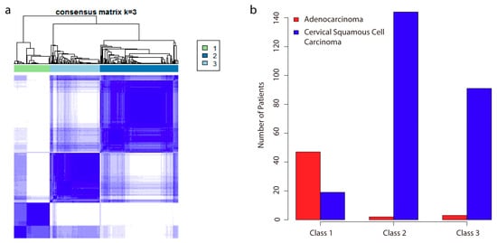 Identification of subclasses and association with histological status. (a) Consensus clustering of DNA methylation reveals three distinct subclasses of cervical cancer. K is the number of clusters generated. The heat map is a visual representation of the consensus matrix, which is a matrix of sample pairs. Each matrix entry measures the proportion of times the pair’s samples are clustered together across resampling iterations. In the heat map, values ranging from 0 (corresponding to two samples that are never clustered together) to 1 (corresponding to two samples that are always clustered together) are represented by white to dark blue, respectively. Samples in the matrix are ordered according to their cluster, resulting in a block-diagonal matrix. A dendrogram atop the heatmap is shown, which represents each cluster 1, 2, and 3, respectively; (b) bar plots show the number of patients in each subclass and their histological status.