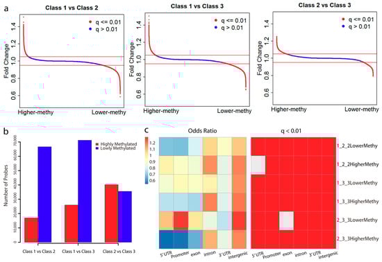 Differentially methylated probes and their genomic distribution. (a) Distribution of probes according to their fold change between each two subclasses. Probes with a q-value less than 0.01 are marked in red and the remaining in blue. Horizontal lines in red represent fold change = 1.05 and fold change = 0.95, respectively. Probes with a fold change > 1.05 and a q-value < 0.01 were selected as highly methylated, and a fold change < 0.95 and a q-value < 0.01 as lowly methylated. (b) Distribution of the number of highly and lowly methylated probes between each of the subclasses. (c) The genomic region enrichment of differentially methylated probes between subclasses. We calculated the number of differentially methylated probes, and the number of all probes on the bead array located in each genomic region. Fisher’s exact test was used to test the enrichment. Heat maps show the odds ratio and adjusted p-value for each category. “1_2_2LowerMethy” represents the lowly methylated probes in Class 2 in comparison with Class 1, “1_2_2HigherMethy” represents the highly methylated probes in Class 2 in comparison with Class 1, and so on.