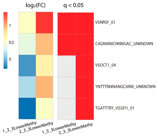 TFs binding enrichment around the lowly methylated promoters in Class 3. We found only these lowly methylated promoters in Class 3 showed significant TFs binding enrichment (Fisher’s exact test, adjusted p-value < 0.05). Heat maps show the log2 fold enrichment and significance of each TF binding around these promoters. The high value of the log2 fold enrichment means the TF is highly enriched. The significance of enrichment is marked in red (q-value less than 0.05) in the right heat map. All TFs in the right side of the heat map were obtained from the Molecular Signatures Database (MSigDB). “1_3_3LowerMethy” represents the lowly methylated probes in Class 3 in comparison with Class 1; “2_3_3LowerMethy” represents the lowly methylated probes in Class 3 in comparison with Class 2. FC, fold change (see Methods).