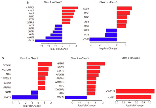 Significantly expressed TFs and driver genes. Bar plots of log2 fold change in differentially expressed TFs (a) and driver genes (b) between each subclass. The bar in red means high expression and blue means low expression. Gene marked with an asterisk indicates that its high or low expression was associated with patient survival (Figure S8).