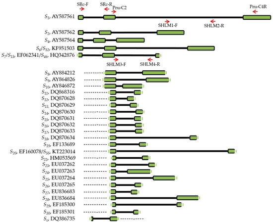 The combination of the primers Pru-C2 and PruC4R was inefficient in 15 genotypes with no amplification fragments obtained. Therefore, new specific primers were designed to amplify the second intron of the S1 and S7 alleles (Table 2, Figure 1). The primers SHLM1 and SHLM2 amplified a fragment of 650 bp from the S1 allele (Figure 1 and Figure 2). However, while the sequence of S1 has been previously reported [41] (AY587561), the S7 allele has only been identified by PCR analysis and no sequence has been yet included in the NCBI database. Thus, using the primers Pru-C2 and PruC4R, we cloned and sequenced the fragment of 900 bp that was obtained from the cultivar ‘Charisma’ (Sc/S7, [24]), which corresponds to the S7 allele [33]. Surprisingly, the cloned sequence resulted in a fragment of 915 bp (Figure S2) that showed a 99% identity with the partial coding sequence (790 bp, EF062341, unpublished), of the S13 allele and with a fragment of 830 bp that corresponds to the unpublished S46 allele (HQ342876). The S13 allele (DQ870629) has also been identified by Zhang et al. [34], but the sequence of the gen bank accessions EF062341 and DQ870629 are different, and, consequently, both sequences have been considered as two different S-alleles. Our results suggest that S7, S13 (EF062341), and S46 could indeed be the same allele. Based on the sequence of 915 bp, we designed the primers SHLM3 and SHLM4 that amplified a fragment of 413 bp. The primers Pru-C2/PruC4R, SHLM1/SHLM2, and SHLM3/SHLM4 enabled the identification of the S genotype of 27 additional cultivars and selections (Table 1).