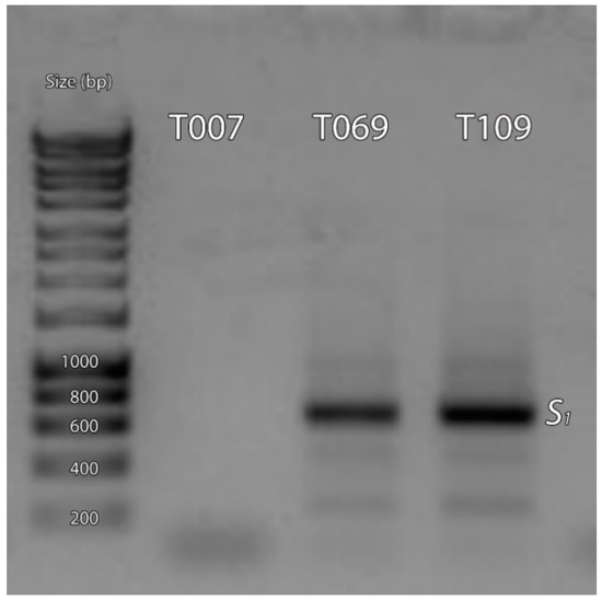 PCR amplification of the RNase second intron region using the specific primers SHLM1 and SHLM2 for the identification of the S1 allele in T007 (S20), T069 (S1S2), and T109 (S1).
