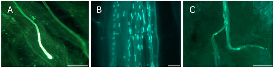 Due to the identical sequence of the RNase gene in the Sc and S8 haplotypes [43], the pairs of primers SRc-F/SRc-R and Pru-C2/PruC4R could not be used for distinguishing between those two alleles. Therefore, the Sc and S8 alleles can only be identified using the primers AprFBC8-F and AprFBC8-R that amplify a fragment of approximately 500 bp in the Sc allele and 150 bp in the S8 allele from the V2 and HVb variable regions of the SFB gene [39]. Thus, the S-genotype of 13 cultivars was identified using the primers AprFBC8-F and AprFBC8-R (Table 2). Moreover, self-(in)compatibility was also evaluated by direct observation of pollen tube growth in the pistil after self-pollination in five selections (“C003”, “C007”, “C009”, “C012”, and “C014”), in which the primers AprFBC8-F/AprFBC8-R were not able to differentiate between the Sc and S8 alleles. Pollen germination was observed on the stigma in all cultivars. Pollen tube growth was arrested in the upper half of the style, showing a terminal callose plug and end thickening (Figure 3A) in three genotypes (“C007”, “C009”, and “C012”) that were considered as self-incompatible. Self-compatibility was considered in two genotypes (“C003” and “C014”), in which the pollen tubes grew along the style (Figure 3B) and at least one of them reached the base of the style in most of the pistils that were analyzed (Figure 3C). As expected, the pollen used was viable and all cross-pollinated pistils displayed pollen tubes at the base of the style (Table 3).