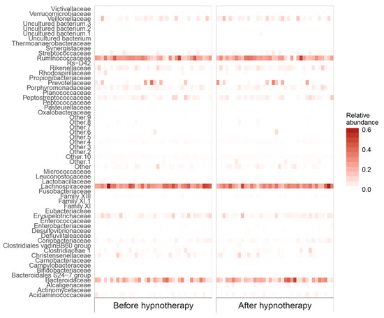 Bacterial abundances on the family level showed some intraindividual variation before and after GHT, but were altogether largely equal over the two time points. Composition of the ten most abundant families before and after GHT is presented in Figure 1, relative abundances of all 58 bacterial families in the sample are visualized in Figure 2. A heatmap of genus abundances before and after hypnotherapy is provided in Supplementary File 1.