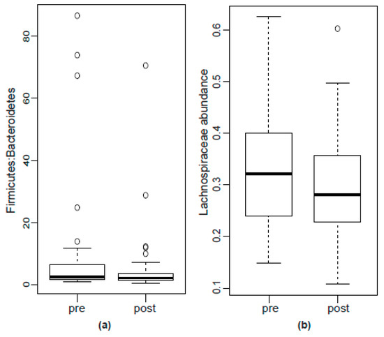Boxplots of (a) Firmicutes:Bacteroidetes ratio and (b) abundance of Lachnospiraceae before and after hypnosis. None of the differences were significant.