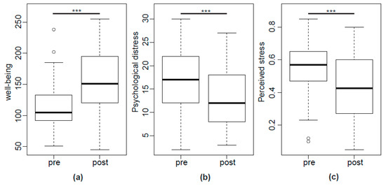 (a) well-being (VAS), (b) psychological distress (HADS), and (c) perceived stress before and after GHT, *** p < 0.001.