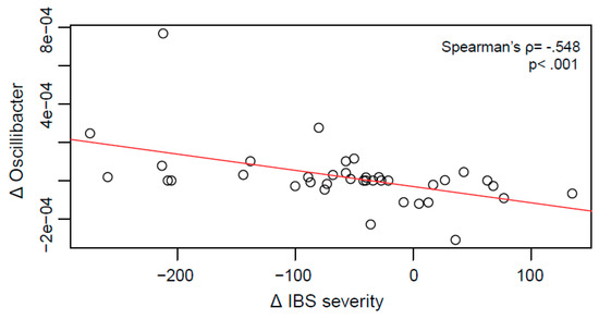 To detect microbial shifts possibly going along with the clinical improvements observed, changes in IBS severity pre-post intervention were correlated with pre-post intervention changes in abundance of bacterial genera. This yielded 17 correlations with Spearman’s rho between 0.32 and 0.55 and p-values between 0.049 and p < 0.001, however, none remained significant after FDR correction (Supplementary File 3). The strongest association was found in Oscillibacter, a member of the Ruminococcaceae family (Figure 6).