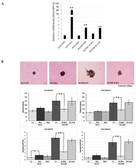 Effects of BRACHYURY transfection on the sphere-forming ability of ACCS (adenoid cystic carcinoma) cells. Brachyury mRNA expression levels of the indicated ACCS (adenoid cystic carcinoma) cells and in derivative clones [ACCS-Brachyury (Bra), ACCS-Neomycin (Neo), ACCSM-sh.Brachyury (sh.Bra), and ACCSM-sh.control (sh.cont)] were quantified using real-time RT-PCR. mRNA level was compared with that in ACCS-GFP cells (parental cell line), and the data are shown in arbitrary units as relative mRNA levels (ACCS-GFP = 1.0) (A). ACCS cells were cultured at a density of 5 × 104 cells/mL in a serum-free medium for floating culture for 10 days (primary spheres). Primary spheres (day 10) were dissociated into individual cells and further cultured at a density of 104 cells/mL for 10 days. The spheres were observed under a phase contrast microscope ((B), top panel). Sphere diameters were measured ((B), middle panel), and numbers (diameter > 100 μm) ((B), bottom panel) were counted. Sphere numbers were standardised as a sphere number per 104 cells originally seeded ((B), bottom panel). The experiments were performed in triplicate, and the data were calculated as mean ± SD. Statistical significance of differences was analysed using the Student’s t test. * P < 0.05, ** P < 0.01.