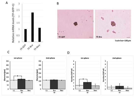 We next analysed the effect of Brachyury on the sphere-forming ability using another type of oral carcinoma cell, squamous cell carcinoma (SCC). For this purpose, we used SCCTF cell lines with Green Fluorescence Protein (GFP) expression (TF-GFP), BRACHYURY stable transfectant TF-GFP cells (TF-Bra), and control vector-transfected and selected by Neomycin (TF-Neo). Forced expression of Brachyury slightly induced (1.8-fold) sphere formation (the number of spheres) in the primary sphere assay compared to the parental TF-GFP cells, but had no effect in the secondary sphere assay (Figure 2). This finding is in agreement with the results obtained using the adenoid cystic carcinoma cells described above. We confirmed the cell proliferation rate on cell culture dish did not change in both cell lines (data not shown).