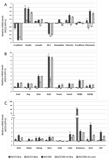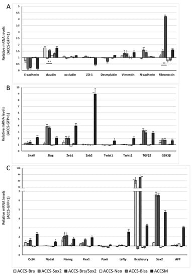 Effects of BRACHYURY transfection on gene expression related to epithelial–mesenchymal transition (EMT) and the cancer stem cell (CSC) phenotype in ACCS cells. mRNA expression levels of the indicated genes in ACCS cells and in derivative clones were quantified using real-time RT-PCR as described in method section. Each mRNA level was compared with that in ACCS-GFP cells (parental cell line), and the data are shown in arbitrary units as relative mRNA levels (ACCS-GFP = 1.0). The expression levels of EMT-related genes (A,B), stem cell markers, and differentiation markers (C) are shown. The experiments were performed in triplicate, and the data were calculated as mean ± SD. Statistical significance of differences was analysed using the Student’s t test. * P < 0.05, ** P < 0.01.