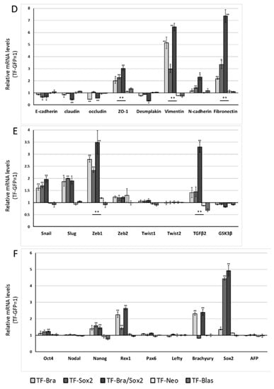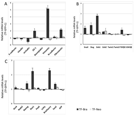 Effects of BRACHYURY transfection on gene expression related to epithelial–mesenchymal transition (EMT) and cancer stemness in TF cells. The mRNA expression levels of the indicated genes in TF cells and derivative clones were quantified by means of real-time RT-PCR. Each mRNA level was compared with that of TF-GFP cells, and the data are shown in arbitrary units as relative mRNA levels (TF-GFP = 1.0). The expression levels of EMT-related genes (A,B), stem cell markers, and differentiation markers (C) are shown. The experiments were performed in triplicate, and the data were calculated as mean ± SD. Statistical significance of differences was analysed using the Student’s t test. * P < 0.05, ** P < 0.01.