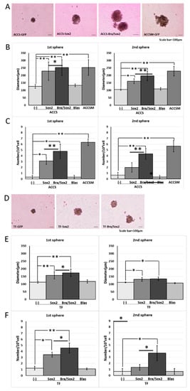 We previously reported that SOX2 knockdown partially inhibits CSC and EMT phenotypes of ACCS-M GFP cells [11]. The data from forced expression and a knockdown of BRACHYURY in oral carcinoma cell lines suggests that Brachyury may need a partner to drive the expression of the CSC phenotype. Therefore, we next analysed the effect of forced co-expression of BRACHYURY and SOX2 on the self-renewal capacity. To this end, we established SOX2 transfectants and BRACHYURY + SOX2 co-expression transfectants of ACCS-GFP and TF-GFP cells: ACCS-Sox2, ACCS-Bra/Sox2, TF-Sox2, and TF-Bra/Sox2. Forced expression of SOX2 enhanced sphere formation (the number of spheres) in the primary sphere assay compared to parental cells ACCS-GFP (9.3-fold) and TF-GFP (2.8-fold), but failed to increase the number of spheres in the secondary sphere assay. In contrast, co-expression of BRACHYURY and SOX2 enhanced sphere formation in both the primary and the secondary sphere assays, with respect to both the diameter and the number of spheres, in ACCS and TF cells. This enhancement reached the level of ACCS-M GFP cells (Figure 5). Forced expression of SOX2 or co-expression of BRACHYURY and SOX2 did not change the cell proliferation rate on cell culture dish (data not shown).