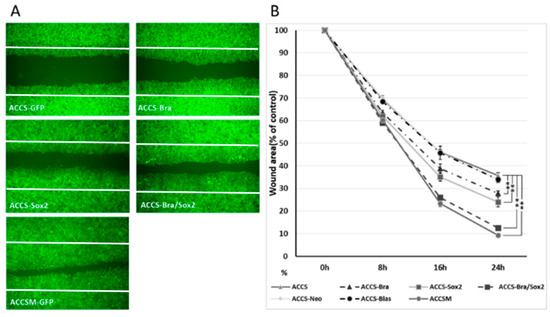 Co-expression of BRACHYURY and SOX2 increased cell migration almost to the level of the CSC-like cells. There was no significance between ACCS-M GFP and ACCS Bra/Sox 2 (P = 0.183) (Figure 7A,B). Cell migration of TF-Bra/Sox2 cells was approximately 3 times faster than that of TF GFP cells (P = 0.001; Figure 7C,D).