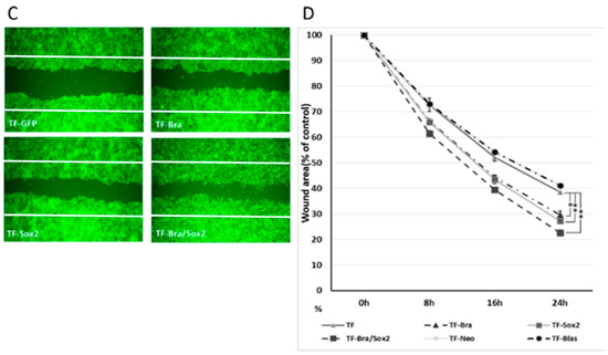 ACCS-Bra/Sox2 and TF-Bra/Sox2 cells were generated via co-transfection of the pCMV6-Brachyury and pUNO1-hSox2 vectors into ACCS-GFP and TF-GFP cells, respectively. The transfection was performed using Lipofectamine LTX (Invitrogen) according to the manufacturer’s instructions.