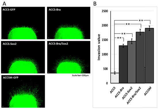 We next analysed the effect of forced expression of BRACHYURY or/and SOX2 on cell invasiveness in vitro using a tumour cell dissemination assay that we established previously [23]. In this assay, carcinoma cells invade to artificial stroma (fibroblast embedded collagen gel) are visualised as fluorescent spots migrating from artificial primary cancer nest (cancer cell pellet solidified with collagen gel). Cancer cell invasiveness is evaluated by the number of invasive cells and their distance from the artificial primary cancer nest. As shown in Figure 8A, ACCS-M GFP cells invaded into artificial stroma very aggressive manner. Co-expression of BRACHYURY and SOX2 strongly enhanced the invasiveness of ACCS-GFP cells to the level of the aggressive ACCS-M GFP cells (P = 0.223) (Figure 8A,B). Figure 8B shows the comparison of invasiveness among the ACCS cell lines. Relative invasiveness values (ACCS GFP = 1.0 arbitrary unit) were 3.7 (ACCS-Bra), 4.1 (ACCS-Sox2), 5.0 (ACCS-Bra/Sox2), and 5.6 (ACCS-M GFP). Expression of BRACHYURY or SOX2 increase the cell invasiveness (P < 0.01) but failed to reach the level of ACCS-M.