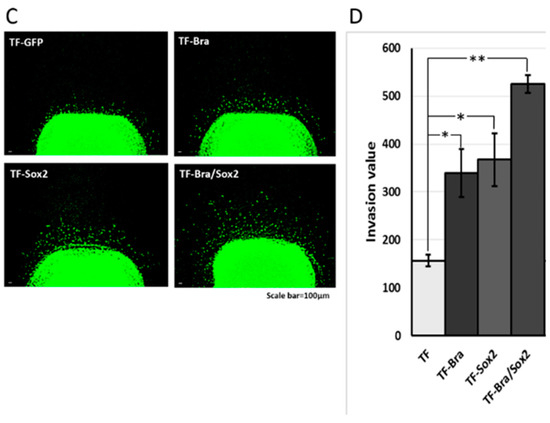 Invasiveness of TF-GFP (squamous cell carcinoma) cells was strongly enhanced by co-expression of BRACHYURY and SOX2 (Figure 8C). Figure 8D shows comparison of the invasiveness among the squamous cell carcinoma cell lines. Relative invasiveness values (TF GFP = 1.0) were 2.2 (TF-Bra), 2.3 (TF-Sox2), and 3.3 (TF-Bra/Sox2).