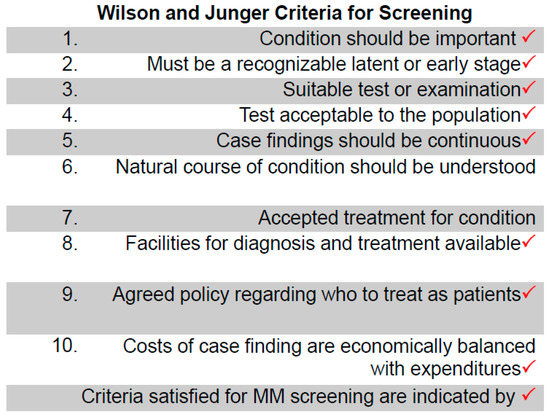 - Altrock, P.M.; Ferlic, J.; Galla, T.; Tomasson, M.H.; Michor, F. Computational Model of Progression to Multiple Myeloma Identifies Optimum Screening Strategies. JCO. Clin. Cancer Inform. 2018, 2, 1–12. [Google Scholar] [CrossRef]