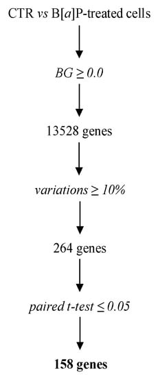 The statistical filtration of the genes differentially expressed between CTR and B[α]P-treated samples was performed using the Annotation, Mapping, Expression and Network suite of tools []. Briefly, we first filtered genes with at least one signal above the background expression cutoff (≥0.0) and with a minimal variation of 10% between both experimental conditions as determined by the inflection point of the fold-change curve (Supplementary Figure S1). Finally, a paired Student’s t test (p ≤ 0.05) was used to identify significantly differentially expressed genes which were further classified into two expression patterns: Up-regulated and down-regulated genes after B[α]P exposure.