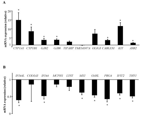 We then performed RT-qPCR assays using the same equimolar pools of RNAs as those in microarray experiments, in order to confirm transcriptional changes observed for candidate genes selected from the transcriptome analysis. We thus selected the most significantly affected genes: CYP1A1 and 1B1, gap junction beta-2 (GJB2) and beta-6 (GJB6) proteins, TCDD-inducible poly(ADP-ribose) polymerase (TIPARP), transmembrane protein 167A (TMEM167A), oligodendrocyte transcription factor 3 (OLIG3), cyclin-dependent kinase-binding protein (CABLES1), proto-oncogene c-KIT and E3 ubiquitin ligase specificity subunit (ASB2) for the 10 most up-regulated genes; IFN-induced proteins 44L (IFI44L), 44 (IFI44), p78 (MX1) with tetratricopeptide repeats 2 (IFIT2), collagen (COL6A3), microcephalin MCPH1, lysosomal trafficking regulator (LYST), enzyme oligoadenylate synthetase like (OASL), proteoglycan (PRG4), and cell surface antigen (THY1) for the 10 most down-regulated ones. The direction of changes in mRNA expression determined by RT-qPCR closely matched the microarray data for all the genes tested, except for TMEM167A which rather showed a down-regulated expression (Figure 2). Thus, CYP1A1, CYP1B1, GJB2, GJB6, TIPARP, OLIG3, CABLES1, KIT and ASB2 transcriptional levels were confirmed to be up-regulated after B[α]P exposure; with inductions reaching a significant level for all these genes except for OLIG3 and TIPARP (Figure 2A). RT-qPCR analysis also reported the decrease in expression of the most down-regulated genes identified by our microarray study with a significant effect for IFI44L, IFI44, MX1, OASL, PRG4, IFIT2 and THY1 (Figure 2B).