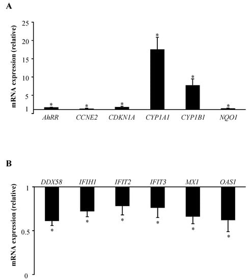 Among genes belonging to “AhR signaling”, we recently reported the regulation of CYP1A1, CYP1B1 and the cyclin-dependent kinase inhibitor 1A (CDKN1A) in human T lymphocytes upon exposure to B[α]P []. The AhR repressor (AhRR), the cyclin E2 (CCNE2) and the NAD(P)H dehydrogenase (NQO1) have already been reported to be robust targets of B[α]P but, in different cell types, but not in primary T lymphocytes [,]. We then validated by RT-qPCR assays these changes in AhRR, CCNE2, CDKN1A, CYP1A1, CYP1B1, and NQO1 gene expression changes using the 16 individual RNA samples isolated from CTR and B[α]P-treated T lymphocyte cultures (Figure 3A). Interestingly, “IFN signaling” and “activation of IRF by cytosolic pattern recognition receptors” pathways were found to be closely associated with genes exhibiting a significant down-regulation in human T lymphocytes treated with B[α]P (Table 2). RT-qPCR analysis further validated the gene expression down-regulations of IFIT3, MX1, OAS1 expressions (all related to “IFN signaling”) and of the RNA helicase (DDX58), the IFN-induced protein with helicase C domain (IFIH1) and IFIT2 (all belonging to “activation of IRF by cytosolic pattern recognition receptors”) (Figure 3B), using the same 16 RNA samples as for AhR signaling-related genes (Figure 3B). Such an analysis identifies these IFN-related proteins as novel target genes for B[α]P.