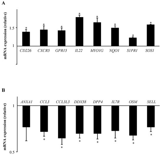 Interestingly, these IPA functional data revealed the prominence of categories related to lymphocyte movement for B[α]P-regulated genes. Based on that, we then decided to focus on gene sets linked to this function. Consistent with our transcriptomic data, and using RT-qPCR on the same pools of RNA as those used in microarray experiments, mRNA expressions of the surface receptors CD226, CXCR5, GPR15, and S1PR1, the interleukin IL-22, the plasma-membrane-associated class I myosin MYO1G, NQO1, and the membrane-bound guanine nucleotide binding protein SOS1 were found to be significantly up-regulated after exposure to B[α]P (Figure 4A). We also confirmed the decreased mRNA expressions of the annexin A1 (ANXA1), the chemokines (C-C motif) ligands CCL3, CCL3L3, DDX58, the membrane dipeptidyl peptidase 4 (DPP4), the interleukin 7 receptor (IL7R), the oncostatin M (OSM) and the leukocyte-endothelial cell adhesion molecule (SELL), with all of these repressions reaching a significant level, except for ANXA1 (Figure 4B).