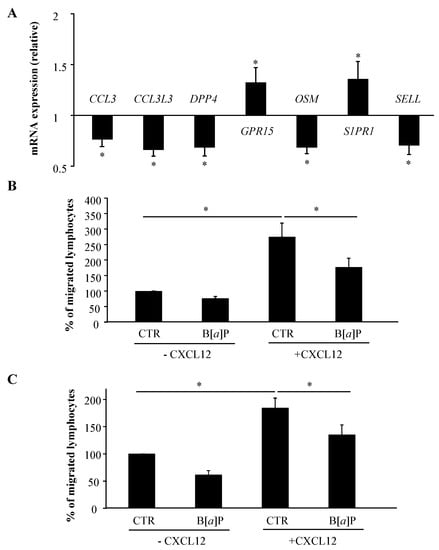 Based on its effects on the mRNA expression of genes that are known to be related to lymphocyte movement, B[α]P was thus identified as a potential modulator of T lymphocyte recruitment. To gain insight into this role of B[α]P, we first used the 16 individual RNA samples isolated from CTR and B[α]P-treated T lymphocytes to validate the unexpected regulation of specific genes linked to T cell homing and trafficking, i.e., CCL3, CCL3L3, DPP4, GPR15, OSM, S1PR1 and SELL. As shown in Figure 5A, mRNA expressions of GPR15 and S1PR1 were significantly up-regulated, whereas those of CCL3, CCL3L3, DPP4, OSM and SELL were down-regulated in human T lymphocytes after a 48-h treatment with B[α]P. These genes therefore represent novel target genes for B[α]P, and highlight the possible interplay between B[α]P exposure and altered T lymphocyte recruitment. This next prompted us to further explore the effect of B[α]P on the migration of primary human T lymphocytes by performing functional experiments. The molecular processes involved in T lymphocyte migration are not only chemotaxis, mainly mediated by chemokines/cytokines, but also cellular adhesion, involving selectins or surface receptors []. We first developed a transwell assay to investigate the possible regulation of T lymphocytes chemotaxis by B[α]P. To do so, we used a gelatin-precoated 8 µm pore cell culture insert in which primary human T lymphocytes, treated or not with B[α]P, were allowed to migrate to the basolateral compartment of the transwell system either containing or not containing CXCL12, an highly efficient chemoattractant for T lymphocytes classically used in chemotaxis assays []. As shown in Figure 5B, CXCL12 clearly increased the percentage of migrated T lymphocytes, confirming the response of T lymphocytes to this cytokine, and B[α]P significantly inhibited this CXCL12-induced chemotaxis. We next developed another transwell assay to evaluate T lymphocyte migration through the blood vessel wall. Therefore, we compared the ability of CTR and B[α]P-treated T lymphocytes to migrate across Tumor Necrosis Factor-α-stimulated HMEC-1 in response or not to CXCL12, which also plays an important role in the transendothelial migration of T cells in response to immune processes []. Interestingly, B[α]P decreased T lymphocyte migration across membrane coated with activated endothelial cells, with a significant inhibition in response to CXCL12 (Figure 5C). Altogether, these data indicate that B[α]P cause a significant inhibition of the CXCL12-induced chemotaxis and transendothelial migration of T lymphocytes, therefore identifying a novel immunotoxic effect of this contaminant.