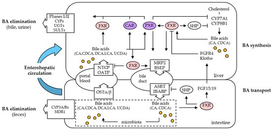 2.4. Regulation of Bile Acid Metabolism and Elimination by Bile Acid/Xenobiotic Nuclear Receptors
