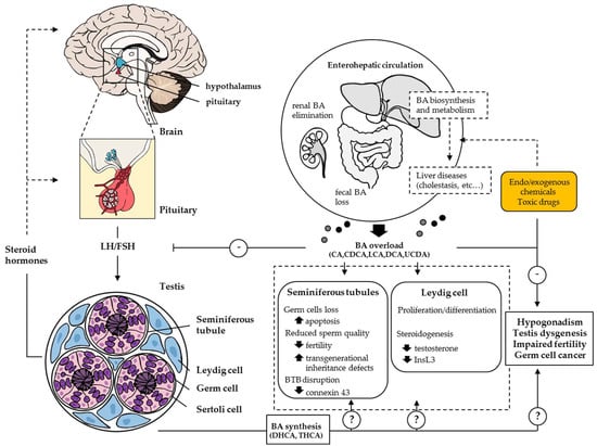 - Baptissart, M.; Vega, A.; Martinot, E.; Pommier, A.J.; Houten, S.M.; Marceau, G.; de Haze, A.; Baron, S.; Schoonjans, K.; Lobaccaro, J.M.; et al. Bile acids alter male fertility through G-protein-coupled bile acid receptor 1 signaling pathways in mice. Hepatology 2014, 60, 1054–1065. [Google Scholar] [CrossRef] [PubMed]