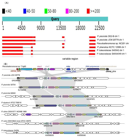 - Yu, M.; Tang, K.; Liu, J.; Shi, X.; Gulder, T.A.; Zhang, X.H. Genome analysis of Pseudoalteromonas flavipulchra JG1 reveals various survival advantages in marine environment. BMC Genomics 2013, 14, 707. [Google Scholar] [CrossRef] [PubMed]