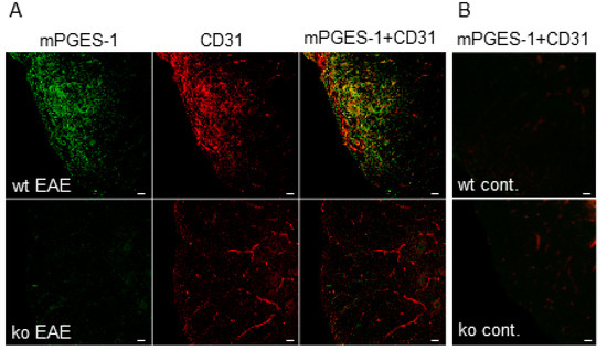 Expression of microsomal PGE synthase-1 (mPGES-1) in CD31-positive (CD31+) endothelial cells (ECs). Immunohistochemical staining of mPGE-1 (green) with CD31 (red) in the inflammatory regions of spinal cords of wild-type (wt) experimental autoimmune encephalomyelitis (EAE) mice and mPGES-1-deficient (mPGES-1−/−) EAE mice (A) and in the spinal cords of wt control mice and mPGES-1−/− control mice (B). Scale bars, 20 μm (for all images); wt, wild-type; ko, mPGES-1−/−; cont., naïve mice; EAE, EAE mice.