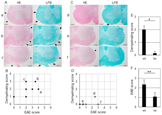 Histopathology of EAE mouse spinal cords at 19 days after immunization. Sections of lumbar spinal cord from wild-type (wt) experimental autoimmune encephalomyelitis (EAE) mice (A). Hematoxylin–eosin H–E staining showed massive infiltration of mononuclear cells into the parenchyma (left panel, arrowhead), and luxol fast blue (LFB) staining showed the diffuse demyelination (right panel, arrow) in wt EAE mice. Relationship between paralysis score and demyelinating score in wt EAE mice (B). Points a, b, and c in (B) corresponded to each panel in (A). Sections of lumbar spinal cord from microsomal PGE synthase-1 (mPGES-1)-deficient (mPGES-1−/−) EAE mice (C). H–E staining showed that infiltration was localized to the intravascular or leptomeningeal space (left panel, arrowhead), and LFB staining showed little demyelination (right panel, arrow). Relationship between paralysis score and demyelinating score in mPGES-1−/− EAE mice (D). Points d, e, and f in (D) corresponded to each panel in (C). Demyelinating score in wt EAE mice and mPGES-1−/− EAE mice (E). Paralysis score in wt EAE mice and mPGES-1−/− EAE mice (F). Scale bars, 200 μm (for all images); wt, wild-type; ko, mPGES-1−/−; H–E, hematoxylin–eosin, LFB, luxol fast blue. * p < 0.001, ** p < 0.05.
