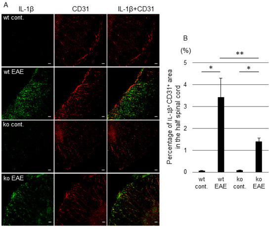 Expression of interleukin-1β (IL-1β) in CD31-positive (CD31+) endothelial cells (ECs) in the spinal cords of control and experimental autoimmune encephalomyelitis (EAE) mice. Immunohistochemical images showing IL-1β (green) and CD31 (red) in the spinal cords of wild-type (wt) control, wt EAE, microsomal PGE synthase-1-deficient (mPGES-1−/−) control, and mPGES-1−/− EAE mice (A). Percentage of IL-1β-positive (IL-1β+) CD31+ area in half of the spinal cord per half of the spinal cord area (B). Scale bars are 20 μm; wt, wild-type; ko, mPGES-1−/−; cont., naïve mice; EAE, EAE mice. * p < 0.001, **p < 0.05.