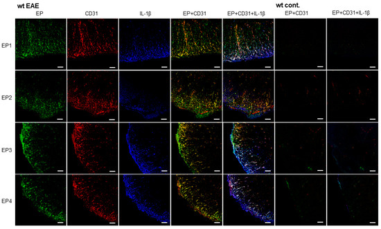 Expression of E-prostanoid (EP) receptors and interleukin-1β (IL-1β) in CD31-positive (CD31+) endothelial cells (ECs) in spinal cords in wild-type (wt) mice. Immunohistochemical images showing EP1–4 (green), CD31 (red), and IL-1β (blue) in the inflammatory region of the spinal cords of experimental autoimmune encephalomyelitis (EAE) wt mice (wt EAE) and in the naïve spinal cords in wt control mice (wt cont.). Scale bars are 50 μm (for all images); wt, wild-type; EAE, EAE mice; cont., naïve mice.