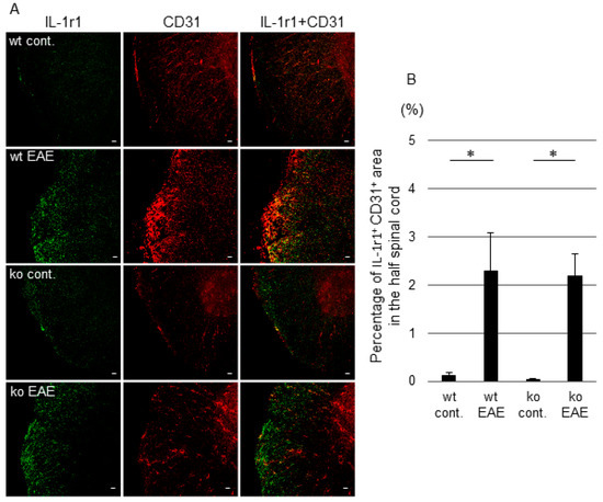 Expression of IL-1 receptor 1 (IL-1R1) in CD31-positive (CD31+) endothelial cells (ECs) in the spinal cords of control and experimental autoimmune encephalomyelitis (EAE) mice. Immunohistochemical images showing IL-1R1 (green) and CD31 (red) in the spinal cords of wild-type (wt) control, wt EAE, microsomal PGE synthase-1 (mPGES-1)−/− control, and mPGES-1−/− EAE mice (A). Percentage of the IL-1R1-positive (IL-1R1+) CD31+ area in half of the spinal cord per half of the spinal cord area (B). Scale bars are 20 μm; wt, wild-type; ko, mPGES-1−/−; cont., naïve mice; EAE, EAE mice. * p < 0.05.