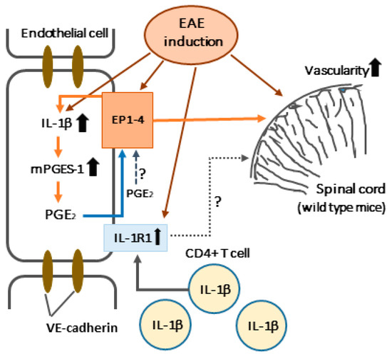 IL-1β is known to stimulate COX-2 induction. Intraperitoneal IL-1β injection induces the expression of COX-2 mRNA in VECs in the brain [51] and leads to the induction of COX-2 mRNA in cultured primary hippocampal neurons [52]. The main inducer of central COX-2 upregulation in the spinal cord is IL-1β, which thus promotes the production of PGE2 and contributes to inflammatory pain hypersensitivity [53]. IL-1β also has an essential role in mediating the activity of nuclear factor kappa B and the transcription of COX-2 in cells of the BBB in inflammation [54]. In the brain, COX-2 inhibitors prevent IL-1β-induced increases in PGE2 production [55], suggesting that IL-1β regulates PGE2 production through the synthesis of COX-2. In addition, crosstalk between microvascular ECs and tumor cells upregulates COX-2 and mPGES-1, which are both strongly inhibited by an IL-1R antagonist [56]. Thus, IL-1β plays a crucial role in the induction of COX-2 and mPGES-1 to produce pathophysiological PGE2, which promotes inflammation. In contrast, we first demonstrated that IL-1β in CD4+ T cells was controlled by endothelial PGE2 derived from mPGES-1 in EAE spinal cords [16]. Therefore, endothelial IL-1β may also be regulated by endothelial PGE2 derived from mPGES-1 in EAE spinal cords as an autocrine function between neighboring ECs.