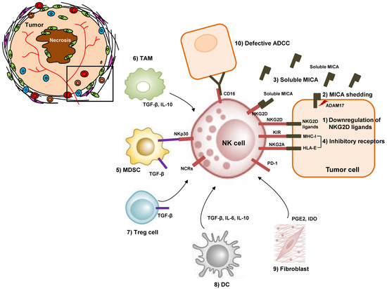 Mechanisms of NK cell dysfunction in tumor microenvironment of HCC. HCC tumor cells inhibit NK cell activity via (1) downregulation of NKG2D ligands and (2) shedding of membrane-bound MICA. (3) Soluble MICA works as a decoy to prevent anticancer surveillance by NK cells. (4) Inhibitory receptors such as KIRs and NKG2A on the surface of NK cells recognize their ligands and suppress NK cell activity. (5) MDSCs inhibit NK cell cytotoxicity, via membrane bound TGF-β and the NKp30 receptor on NK cells. (6) TAMs, (7) Tregs, (8) DCs, and (9) tumor-associated fibroblasts inhibit NK cells via immunosuppressive cytokines. (10) Defective ADCC also occur between tumor cells and NK cells in HCC. NK, natural killer cell; HCC, hepatocellular carcinoma; MDSC, myeloid-derived suppressor cell; TAM, tumor-associated macrophage; Treg, regulatory T cell; MHC-I, major histocompatibility complex class 1; TGF-β, transforming growth factor-β; MICA, MHC-I polypeptide-related sequence A; KIR, killer cell immunoglobulin-like receptor; ADCC, antibody-dependent cell cytotoxicity; PGE2, prostaglandin E2; IDO, indoleamine 2,3-dioxygenase; NKG2A, natural killer group 2 member A; NKG2D, natural killer group 2 member D; HLA-E, human leukocyte antigen E; PD-1, programmed death 1; NCR, natural cytotoxicity receptor.