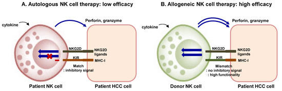 Adoptive transfer of NK cells: Autologous and allogeneic NK cell transfer. (A) In autologous NK cell transfer, anti-tumor activity of NK cells might be limited by the inhibitory signal transmitted by the complex of matched KIR and self MHC class I molecule. (B) In allogeneic NK cell transfer, high cytotoxic responses can be obtained when donor NK cells do not express KIRs matching the MHC class I molecules of the tumor cells. KIR–ligand incompatibility is critical in efficacy of allogeneic NK cell therapy because the mismatch prevents the generation of negative signal and guarantees adequate NK cell activation. NK, natural killer cell; HCC, hepatocellular carcinoma; KIR, killer cell immunoglobulin-like receptor; NKG2D, natural killer group 2 member D; MHC-I, major histocompatibility complex class 1.