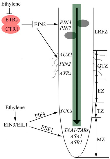 Ethylene affects root growth at two different levels. First, ethylene inhibits cell proliferation in the root apical meristem [11]. Second, ethylene inhibits cell expansion in the root elongation zone [51,63]. The reports of ethylene effects on cell division in roots are conflicting. Ruzicka et al. [51] showed that ethylene affects root growth primarily by regulating the elongation of cells that leave the root meristem but without impact on the root meristem size. Recent studies showed that ethylene negatively regulates root meristem size through inhibiting cell proliferation in the root meristem [11]. Through a targeted expression approach to map the tissue sites of ethylene growth regulation found that the epidermis is the main site of ethylene action controlling plant growth in both roots and shoots [10]. Taken together, ethylene inhibits primary root growth by inhibiting cell proliferation in meristem zone and cell elongation in elongation zone.