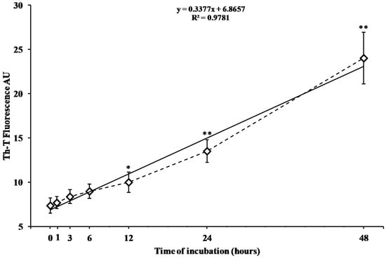 Fluorescence increased linearly as a function of the incubation time. Changes in fluorescence were not significant during the first four incubation times (0, 1, 3, and 6) analyzed (Figure 1). Fluorescence intensity significantly increased after 12, 24, and 48 h of incubation (+35%, +83%, and +226%, respectively, p < 0.01 compared to the value at zero time), indicating a quite long lag time before the aggregation process took place, as well as a relatively slow rate in the phenomenon of hA17–29 aggregation.