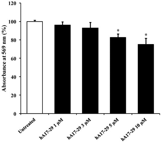 Since in the case of the MTT assay it is not possible to determine whether decreasing values are due to decreased cellular metabolic rate or increased cell death, to confirm that the decreased cell viability measured in our experiments was due to cell death, we performed additional experiments measuring the release of lactate dehydrogenase (LDH) in the culture media. The data in Table S1, showing the percent of increase in LDH equal in absolute values to the percent of decrease in absorbance at 569 nm (cell viability), clearly indicate that increasing concentrations of hA17–29 (1, 3, 5, and 10 µM) lead to an increase in cells death.