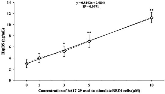 The minimal effective concentration of hA17–29 capable to induce a significant increase in the release of HspB5 was 3 µM. Using this concentration of hA17–29, we found that HspB5 released by RBE4 cells into the medium was 5.2 ng/mL, significantly higher (+79%, p < 0.01) than the concentration found in untreated RBE4 cells (2.9 ng/mL). The release of HspB5 during 48 h increased linearly by increasing the amount of hA17–29 added to the medium. Similar responses to stressing conditions were obtained when using the reference peptide Aβ25–35 (Figure S1).